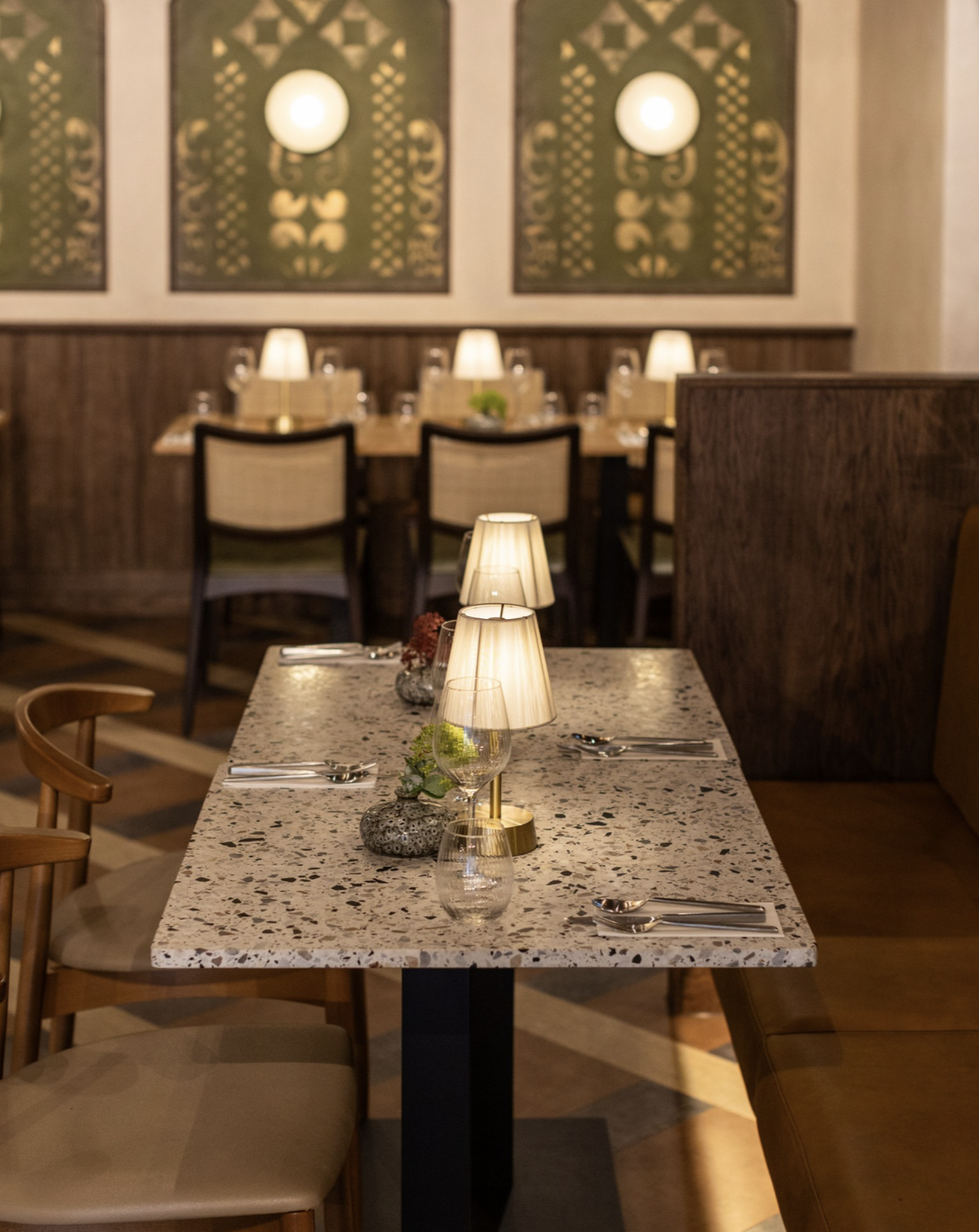 A key feature of the project is the series of bespoke hand-painted murals. The large-scale artwork introduces fluid, organic forms and subtle tonal variations that evoke natural landscapes and traditional craftsmanship. These murals act as focal points throughout the restaurant, adding depth, storytelling and a distinctive identity to the space.