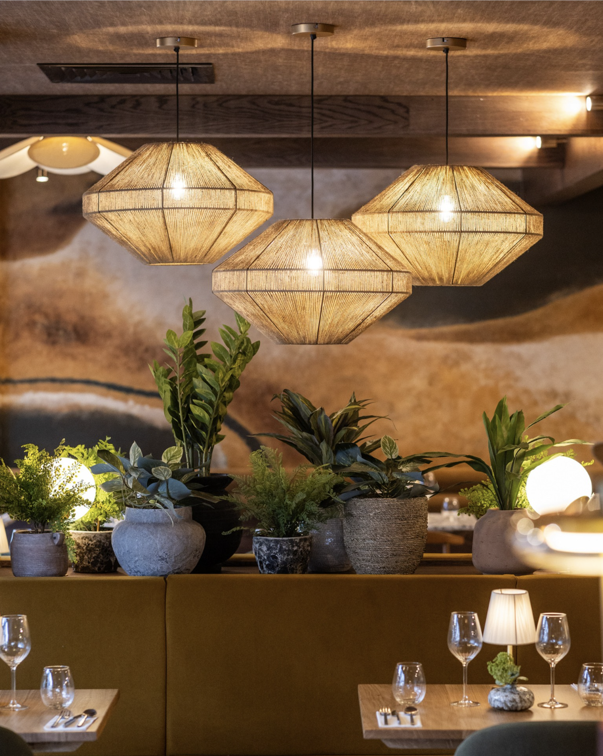 Theme: Contemporary interpretation of Indian warmth and hospitality, blending cultural richness with modern sophistication. We delivered a layered, atmospheric interior that balances warmth, texture and contemporary elegance, working alongside Fifi Interiors to unite bespoke artistry, rich materiality and carefully curated detailing within a welcoming yet refined dining environment. The design is anchored by a palette of earthy terracottas, warm ochres, deep greens and soft neutrals, enriched by ambient low-level lighting and statement woven pendants that cast a soft golden glow across the space. Hand-painted murals introduce artistry and storytelling at scale, while layered live and artificial planting enhances the biophilic quality, bringing softness and vibrancy throughout. The result is an intimate yet dynamic setting that feels both relaxed and elevated, striking a seamless balance between tradition and modern design.